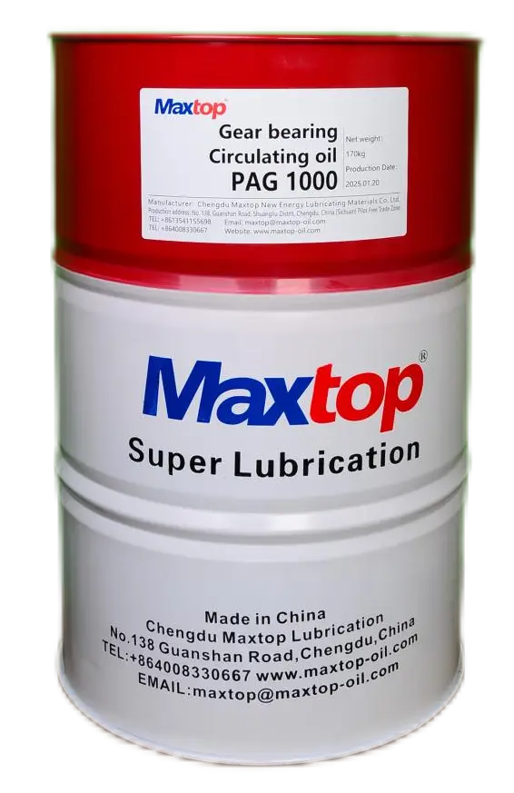 Maxtop gear bearing circulating oil (PAG type) is made of polyalkylene glycol synthetic oil as base oil, and added with extreme pressure, anti-wear, antioxidant and other additives. Gear bearing circulating oil is a highly efficient lubricating oil designed for closed cycle lubrication scenarios such as gear box and bearing system. The core function is continuous lubrication, heat dissipation and cooling, anti-wear and prolong equipment life. It can cover key parts such as gear meshing surface and bearing raceway through the circulation system to ensure stable operation of equipment under harsh conditions such as high speed, heavy load and high temperature.